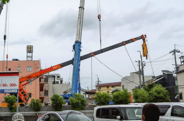 住宅直撃のアーム撤去 大阪 クレーン車事故 写真 共同 日本経済新聞